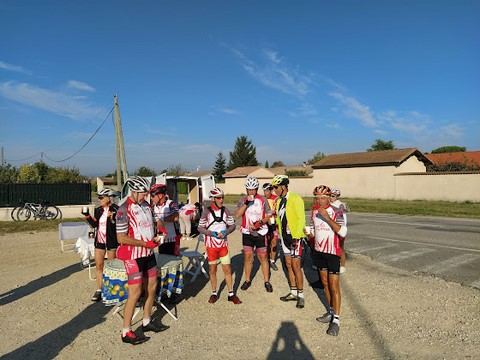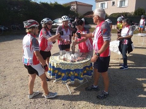 Une petite heure plus tard, le premier groupe arrive à Chabeuil dans le quartier « Les Flandennes » sous un beau ciel bleu et ensoleillé, les cyclos sont accueillis par Babeth, Christine, et Bernard, l’équipe « petite restauration », qui propose un café et une viennoiserie. Après ce petit encas, les voici repartis avec un « menu costaud », les cols des Limouches, de Bacchus et Cavalli.