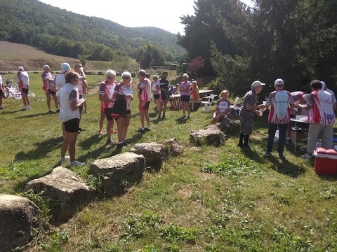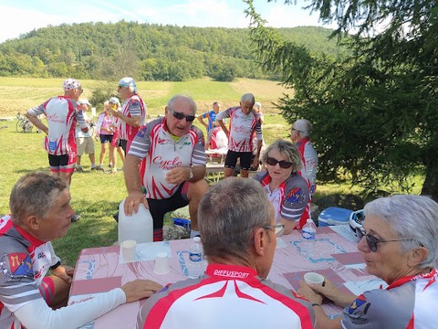 Les tables sont en place (et avec nappes SVP), bancs et chaises (ou rochers pour certains…) peuvent accueillir les cyclos ….Babeth, Christine et Bernard proposent une collation comprenant deux sandwiches, ainsi qu’une belle tarte aux pommes avec le café…Ce moment permet à chacun(e) de profiter de l’instant et partager quelques discussions chaleureuses…..
